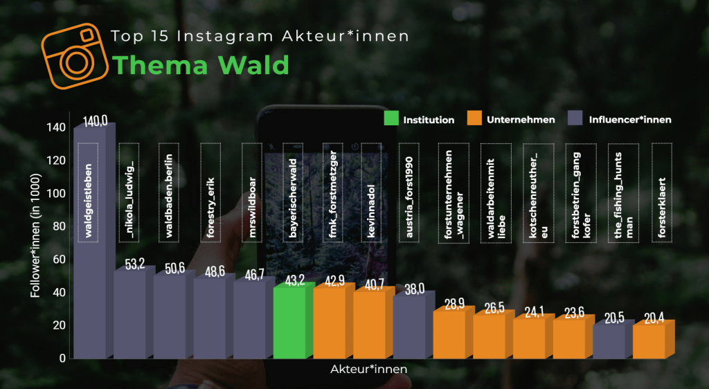 Nach dem Schneeballprinzip konnten 276 Accounts identifiziert werden, die die Einschluss-kriterien „Wald“ und/oder „Forst“ im Namen und/oder Titel tragen. Im nachfolgenden Schritt wurden diese in die folgenden drei Akteurs-Kategorien eingeteilt: Unternehmen, Institutionen und Influencer*innen. Anhand der zugehörigen Anzahl Follower*innen entstand ein Ranking der beliebtesten Accounts aus allen drei Akteurs-Arten.